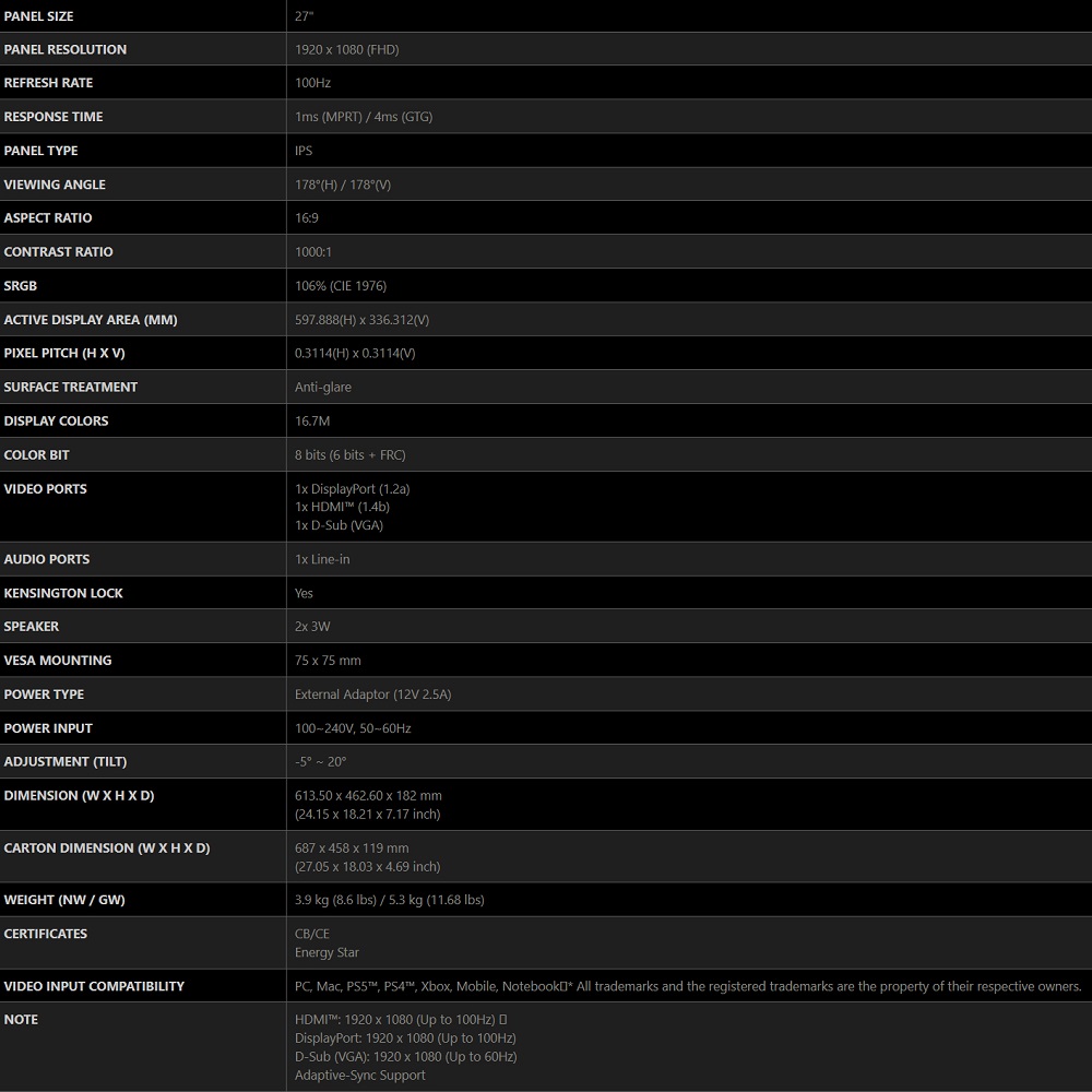MSI PRO MP273A black 27″ IPS 100Hz DP VGA HDMI Spk Monitor